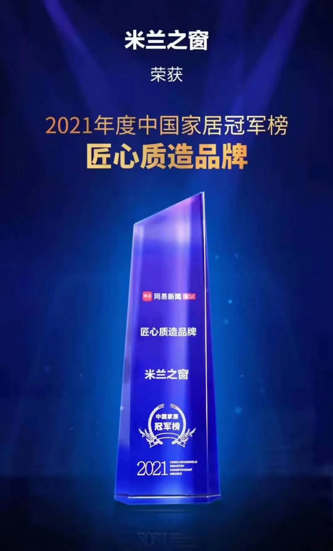 米蘭之窗秉承匠心質(zhì)造精神專注系統(tǒng)門窗領(lǐng)域,從研發(fā)中國首個鋁包木門窗、幕墻系統(tǒng),再到時尚跨界、大玩設(shè)計,二十三年的行業(yè)積淀,始終堅守嚴苛標準,以匠心鑄典范,不斷為消費者帶來高品質(zhì)門窗產(chǎn)品,讓米蘭之窗得以馳騁中國系統(tǒng)門窗領(lǐng)域,助力家居市場健康發(fā)展。正是基于這種專業(yè)專注的企業(yè)精神、精益求精的匠心理念和源源不斷的產(chǎn)品創(chuàng)新力,米蘭之窗奪得“2021中國家居冠軍榜匠心質(zhì)造品牌”。