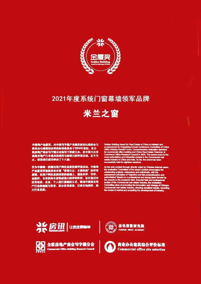 此次榮獲中國地產(chǎn)金廈獎(jiǎng)——“2021年度系統(tǒng)門窗幕墻領(lǐng)軍品牌”,離不開各界對米蘭之窗的認(rèn)可與支持。榮譽(yù)與責(zé)任并行,未來米蘭之家將持續(xù)致力于樹立中國系統(tǒng)門窗行業(yè)標(biāo)桿,引領(lǐng)行業(yè)發(fā)展,為推動(dòng)中國房地產(chǎn)良好發(fā)展作出更大的貢獻(xiàn)。