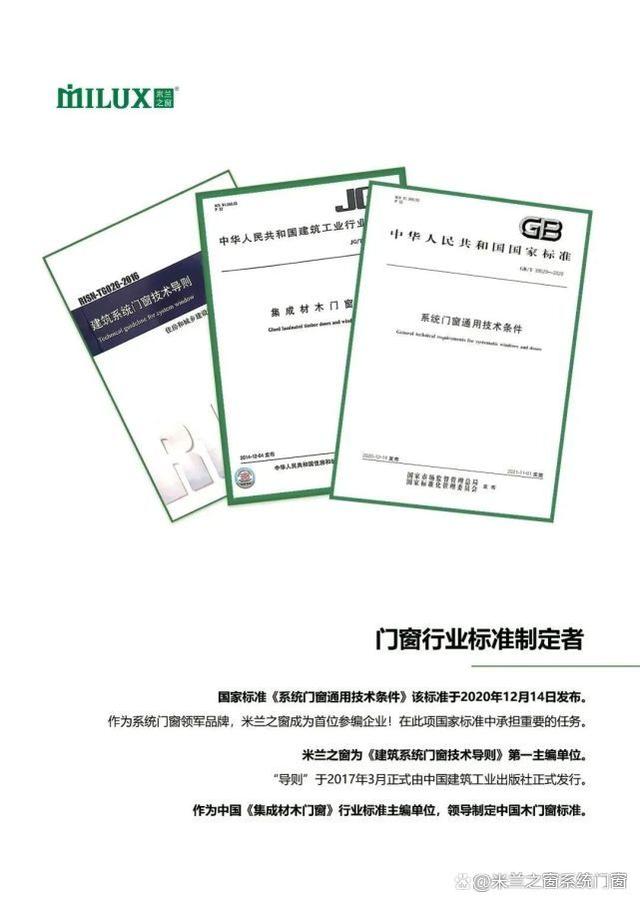 ??生態(tài)文明建設關乎世界未來,綠色低碳環(huán)保是人類共同的目標,門窗企業(yè)與節(jié)能環(huán)保緊密相關。米蘭之窗作為中國建筑金屬結構協會副會長單位、中歐節(jié)能門窗發(fā)展聯盟主席單位,一直致力于門窗行業(yè)的健康發(fā)展。23年深耕系統門窗設計、研發(fā)與制造,致力于拓展系統門窗在消費市場的普及與運用。作為中國唯一一個擁有自主知識產權門窗系統的企業(yè),在多項系統門窗國家標準中承擔重要任務,主編《系統門窗技術導則》、《集成材木門窗標準》、《系統門窗通用技術條件》等多個國家級門窗行業(yè)標準,持續(xù)為中國系統門窗行業(yè)發(fā)展蓄力添能,用可持續(xù)創(chuàng)新引領行業(yè)不斷前行!