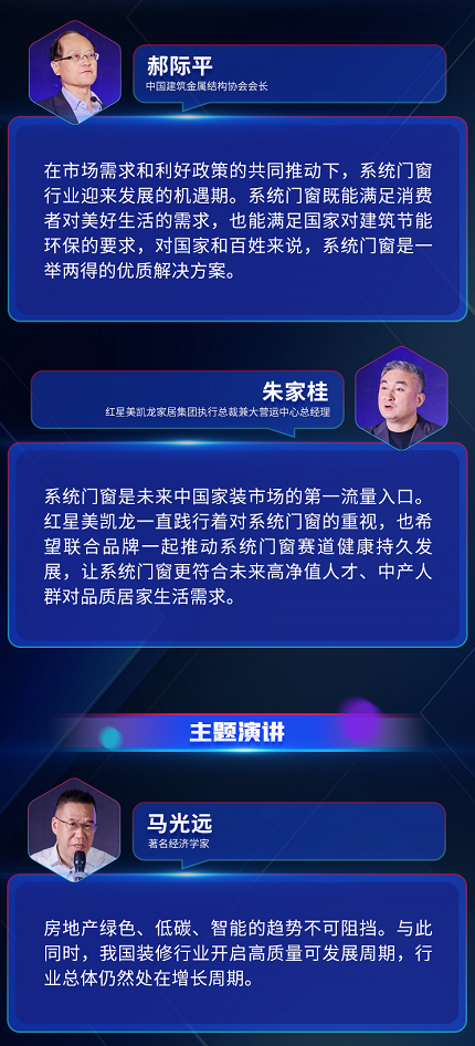 中國建筑金屬結(jié)構(gòu)協(xié)會(huì)會(huì)長郝際平、紅星美凱龍家居集團(tuán)執(zhí)行總裁兼大營運(yùn)中心總經(jīng)理朱家桂紛紛為本次會(huì)議做出致辭。此次大會(huì)特地邀請(qǐng)到著名經(jīng)濟(jì)學(xué)家馬光遠(yuǎn),從宏觀經(jīng)濟(jì)形勢(shì)出發(fā)解讀系統(tǒng)門窗發(fā)展趨勢(shì)。