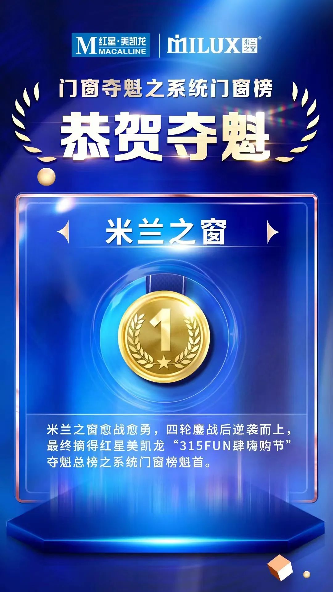 家居行業(yè)“現(xiàn)象級”頂流大促——紅星美凱龍“315FUN肆嗨購節(jié)”正式收官告捷,米蘭之窗登頂系統(tǒng)門窗榜品類奪魁榜榜首!本次活動紅星美凱龍集團10億級資源投入,海陸空集結(jié)、全行業(yè)ALL IN,此次千大品牌共振的家居行業(yè)現(xiàn)象級消費盛宴,米蘭之窗強強聯(lián)合紅星美凱龍,并肩協(xié)作,在戰(zhàn)斗中凝結(jié)友誼,奏響門窗最強音,燃勢打響2022營銷首戰(zhàn)!